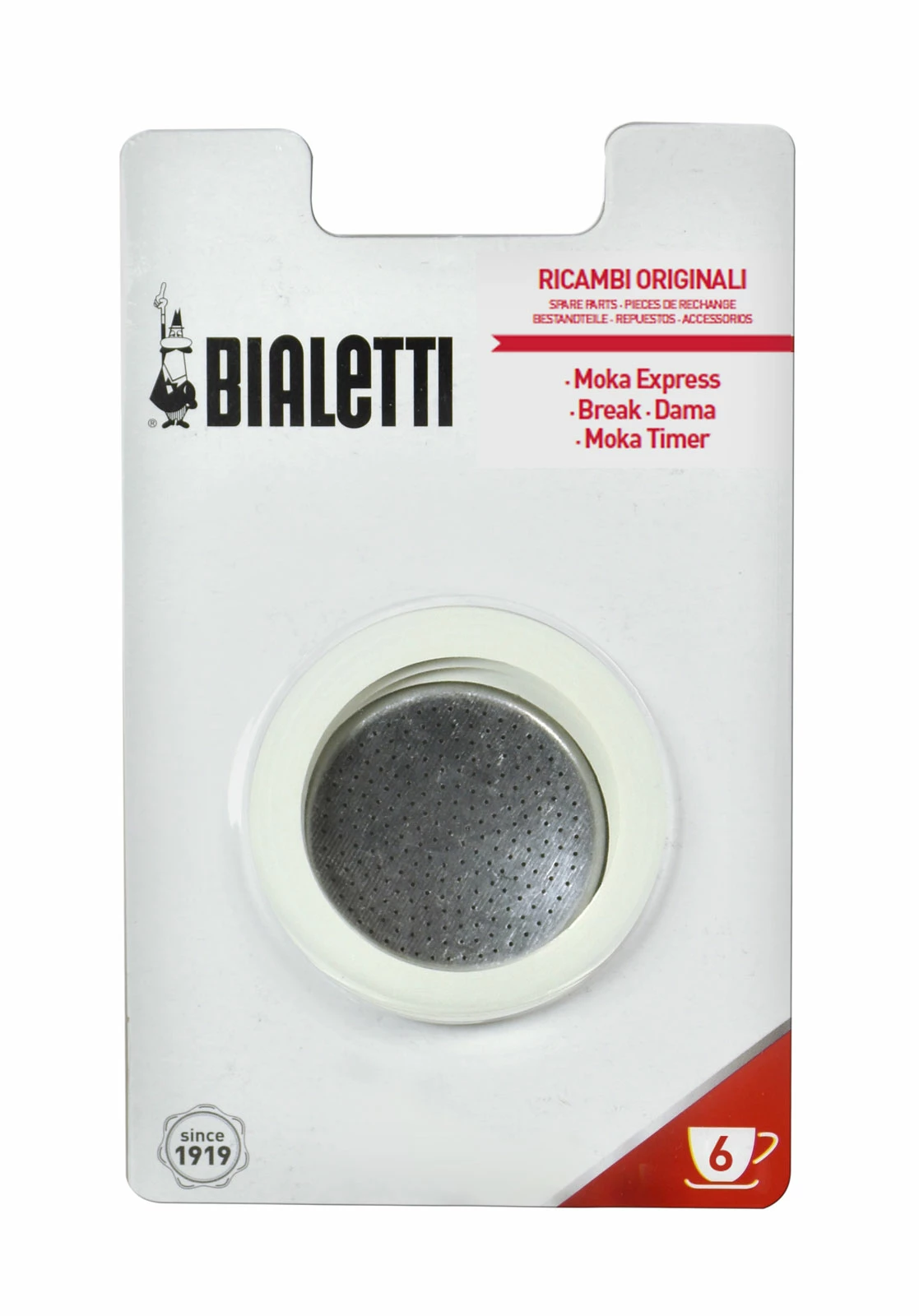 Diese Original Ersatzdichtungen mit Aluminium-Filter der Bialetti Ersatzartikel-Serie ist für die 6 Tassen-Espressokocher Moka Express, Break, Dama und Moka Timer geeignet.