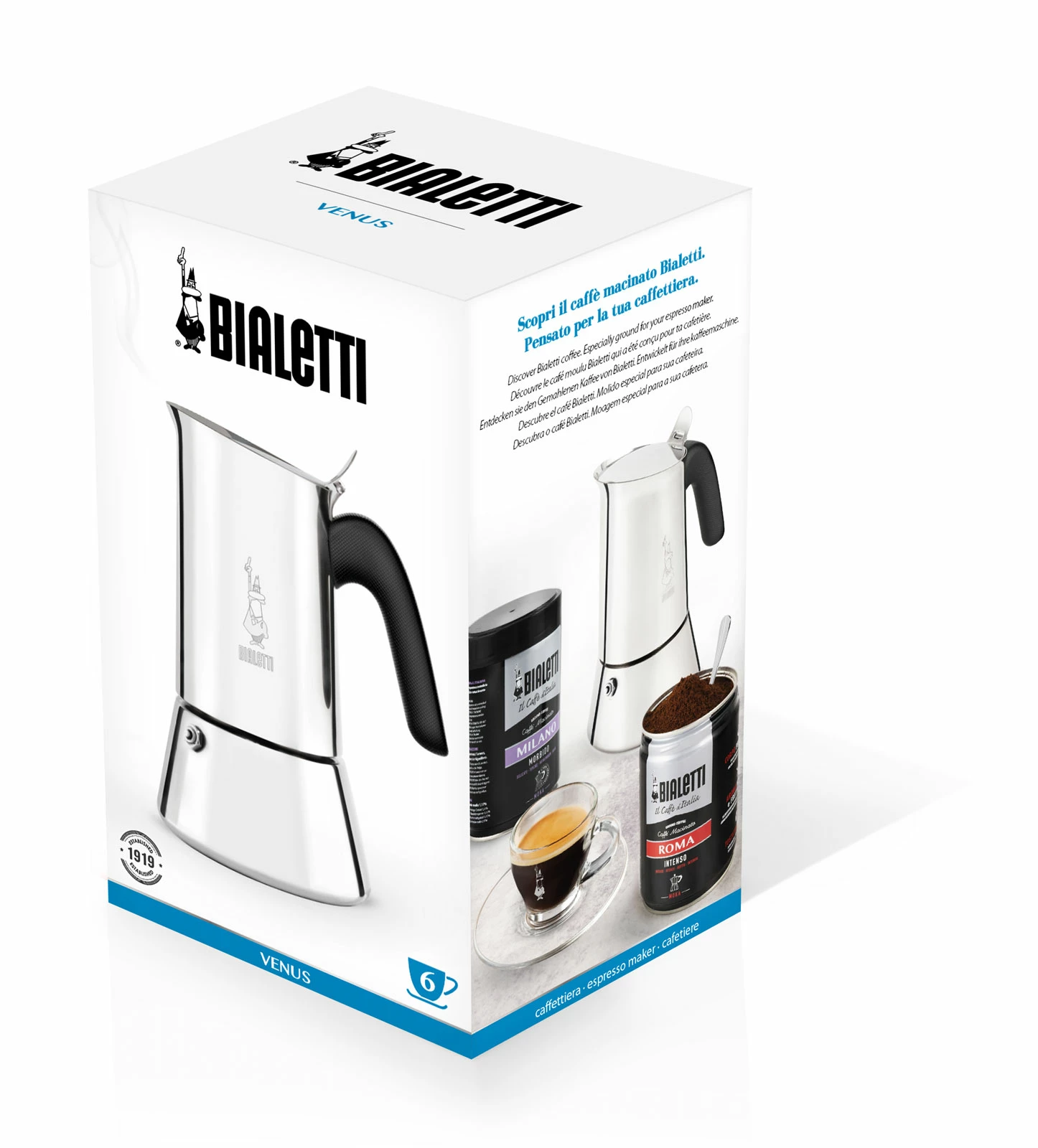 Was Alfonso Bialetti ab 1933 noch persönlich und regional an Marktständen verkaufte, brachte sein Sohn Renato Bialetti nach dem Weltkrieg im großen Stil patentiert auf den italienischen Markt und baute die weltweit größte Fabrik für Kaffeemaschinen auf. Die Zeichnung vom kleinen Mann mit dem Schnurrbart entstand in den 50er Jahren vom Animationszeichner und Filmproduzenten Paolo Campani und ab 1958 wurde es das Bialetti-Logo, heute mit Weltruhm. Die original Moka Express mit ihrem achteckigen Design ist noch immer eine unverändert italienische Ikone, zu Hause in Museen der Welt und so berühmt wie Vespa, Lamborghini und Sophia Loren.