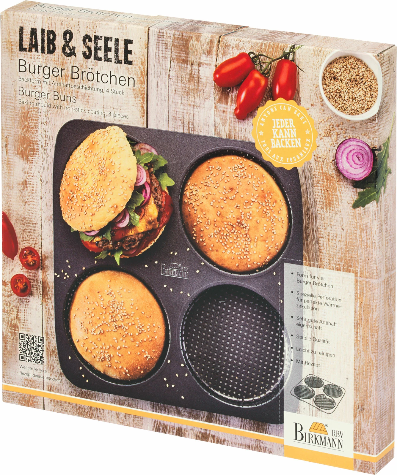 Spielend leicht vier große, leckere Burger-Brötchen mit dem RBV Birkmann Brötchen-Blech gleichzeitig backen und frische Burger nach eigenen Wünschen zubereiten. Die hochwertige Antihaftbeschichtung des Backblechs macht die Brötchen ganz leicht auslösbar und die spezielle Perforation des Backbleches ermöglicht die gleichmäßige Wärmeverteilung und die duftende Kruste. Rezepte werden in der Geschenkverpackung gleich mitgeliefert.