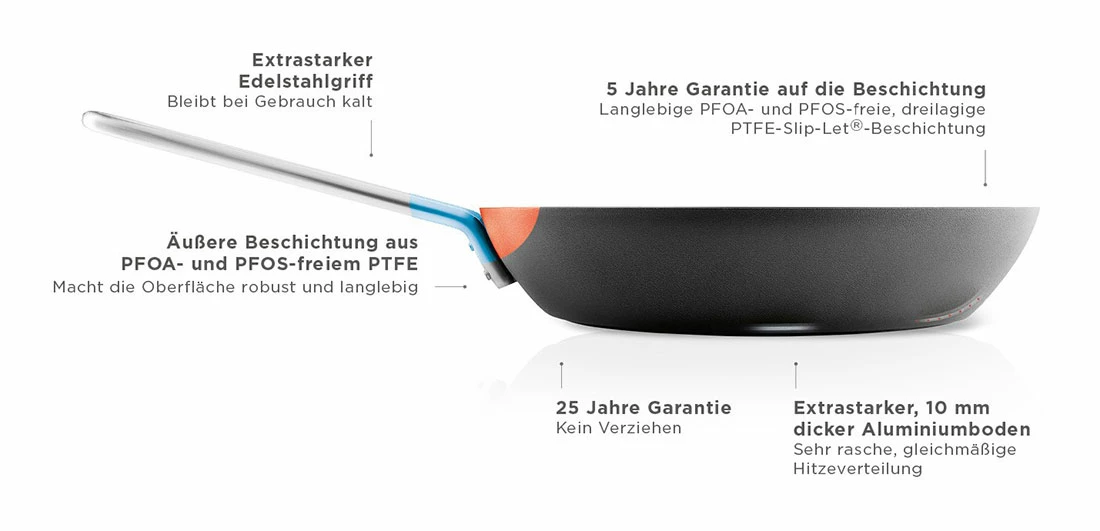 Mit der langlebigen Slip-Let®-Antihaftbeschichtung ist auch Schluss mit angebrannten Speisen und Überhitzung der Beschichtung auf Induktionsherden, denn die Eva Trio-Bratpfannen haben Induction Heat Control. Mit einer speziellen Stahllegierung im Boden der Pfanne schaltet sich auf einem Induktionsherd der Magnetismus bei einer Temperatur von 230 °C aus. Die Eva Trio Professional Brat- und Grillpfannen sind ofenfest bis 260 °C und haben 25 Jahre Garantie auf Form und ebenen Boden. Der charakteristische, kühle Edelstahlgriff ist handlich und die Pfanne lässt sich leicht in der offenen Küche an Leisten oder Wände hängen.