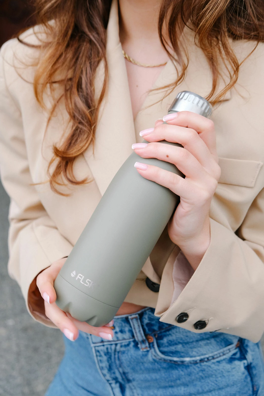 Die FLSK Isolierflaschen sind die perfekte Kombination aus trendigem, nachhaltigem Design und alltagstauglichen Eigenschaften, was sie zu unverzichtbaren Begleitern macht. Hergestellt werden sie aus hochwertigem Edelstahl, der nicht nur geschmacksneutral ist und gut isoliert, sondern diese Flaschen auch sehr stabil macht. Die VICC (Vacuum Insulated Copper Coating) Technologie mit Vakuumschicht zwischen dem Edelstahl und einer zusätzlichen Kupferschicht sorgt für eine hervorragende Isolation. Anders als andere Isolierflaschen oder Thermoskannen mit Glaseinsatz können FLSK Flaschen auch herunterfallen, ohne kaputt zu gehen. Selbst das pulverbeschichtete Äußere nimmt keinen Schaden.