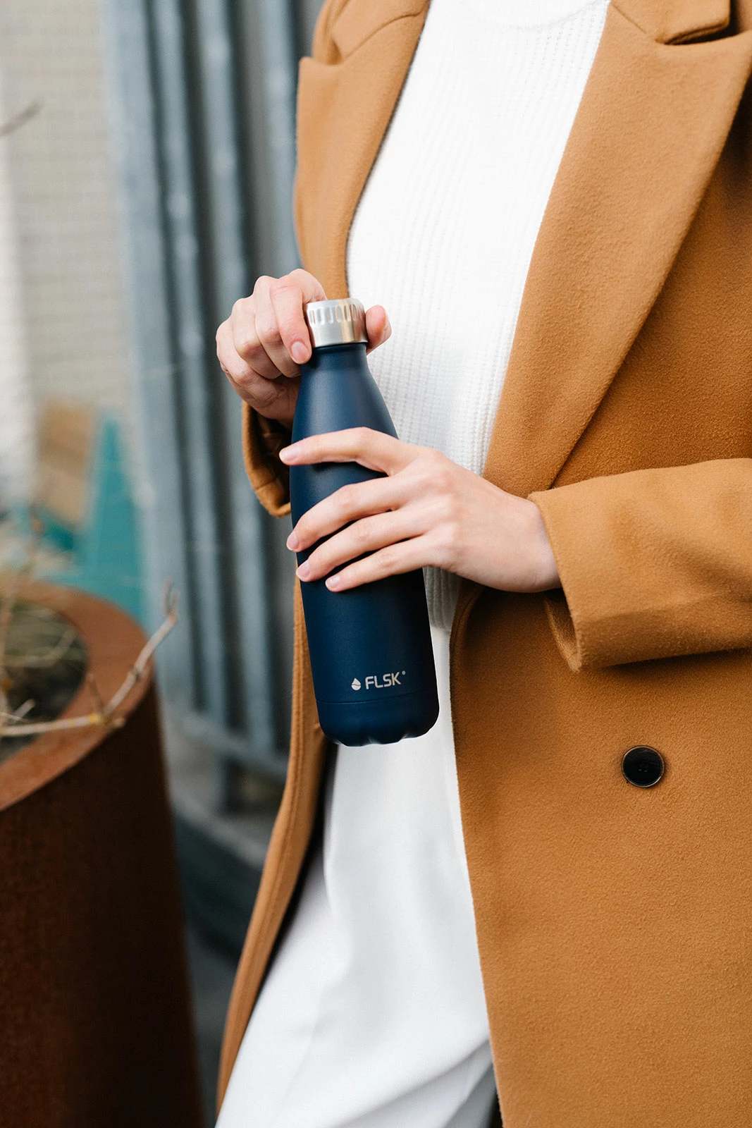 Die FLSK-Isolierflasche [fla:sk, flask] MDNGHT Generation 2 in mitternachtsblau ist eine gelungen optimierte Kombination aus trendigem, nachhaltigem Design und alltagstauglichen Eigenschaften, die diese Edelstahl-Isolierflasche zu einem unverzichtbaren Begleiter macht.