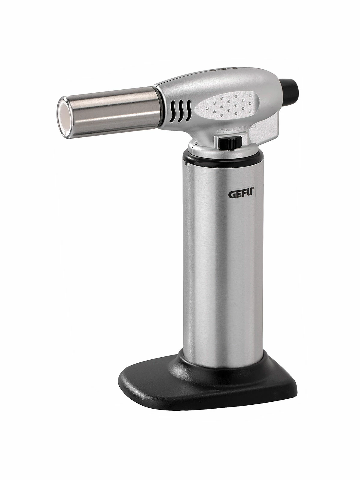 Für Crème-Brûlée-Enthusiasten wird der Flambierbrenner FUEGO von Gefu schnell zu einem unentbehrlichen Helfer werden. Im Handumdrehen karamellisiert er eine Zuckerschicht – aber auch beim Häuten von Gemüse und beim Nachbräunen Ihres Brathähnchens kann er sehr hilfreich sein. Befüllen Sie ihn einfach mit Feuerzeuggas und genießen Sie bis zu 60 Minuten Brenndauer bei stufenloser Flammenregulierung.