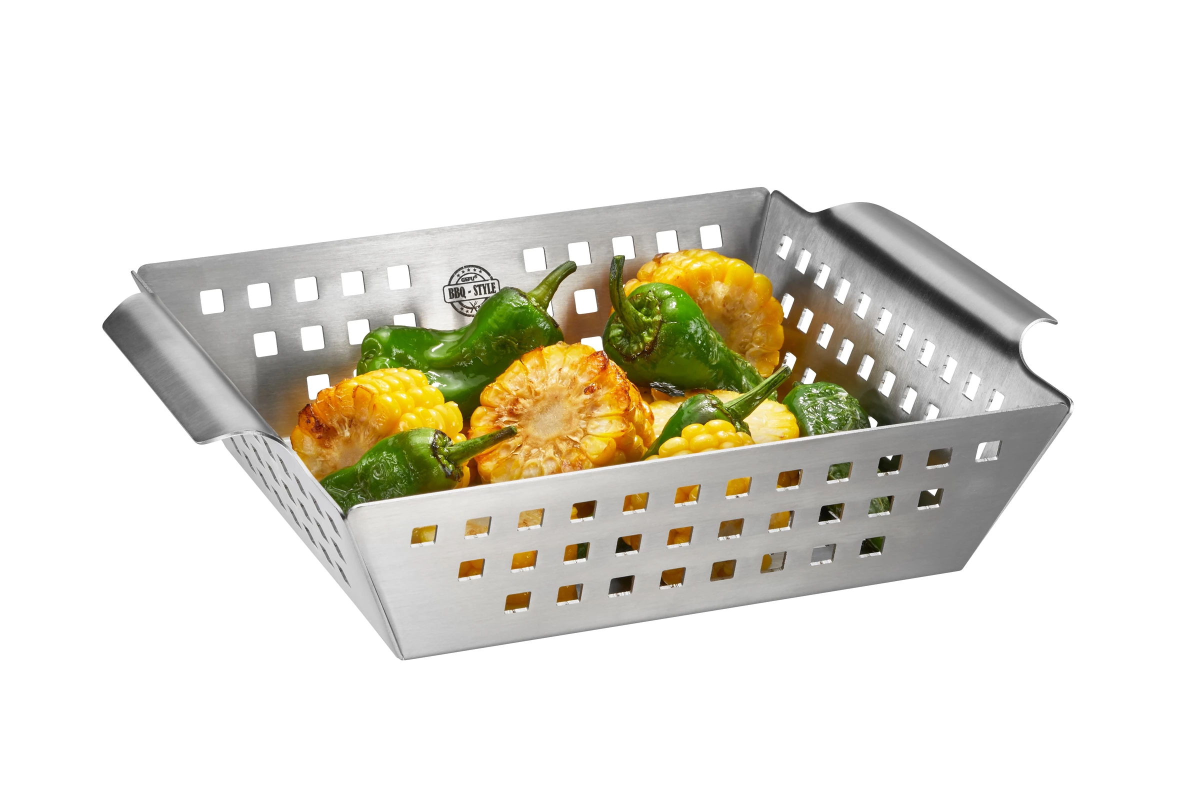 In der GEFU Grillschale BBQ klein 25×21,5x5cm aus Edelstahl fällt nichts durch den Rost; kleine, feine Zutaten von Gemüse, zarte Rosmarinkartoffeln oder Fisch und Garnelen gelingen mit optimaler Hitzezirkulation. Dank der Tragegriffe wird das Grillgut einfach auf den unterschiedlichen Hitzequellen bewegt und umgehend heiß serviert.