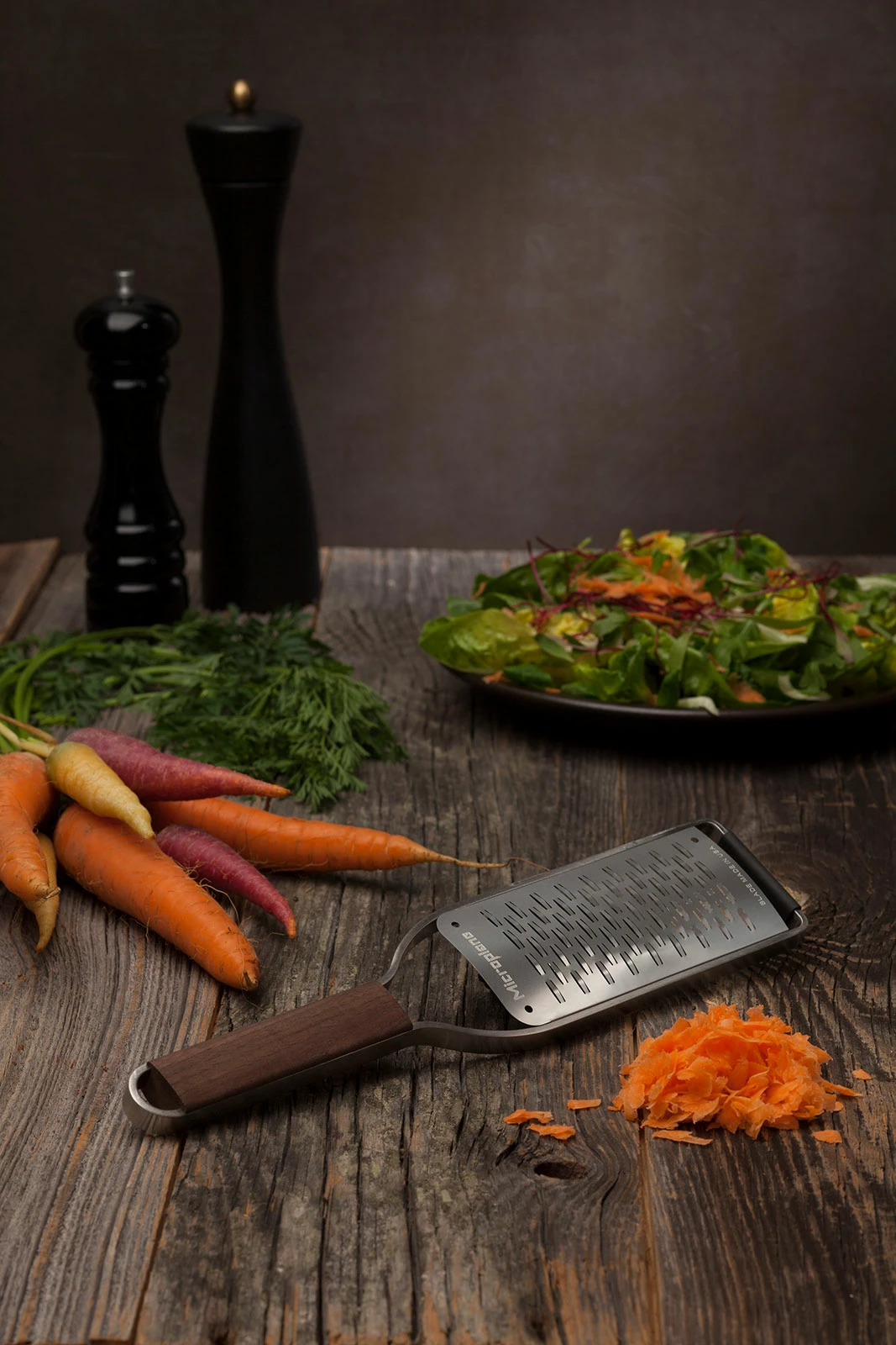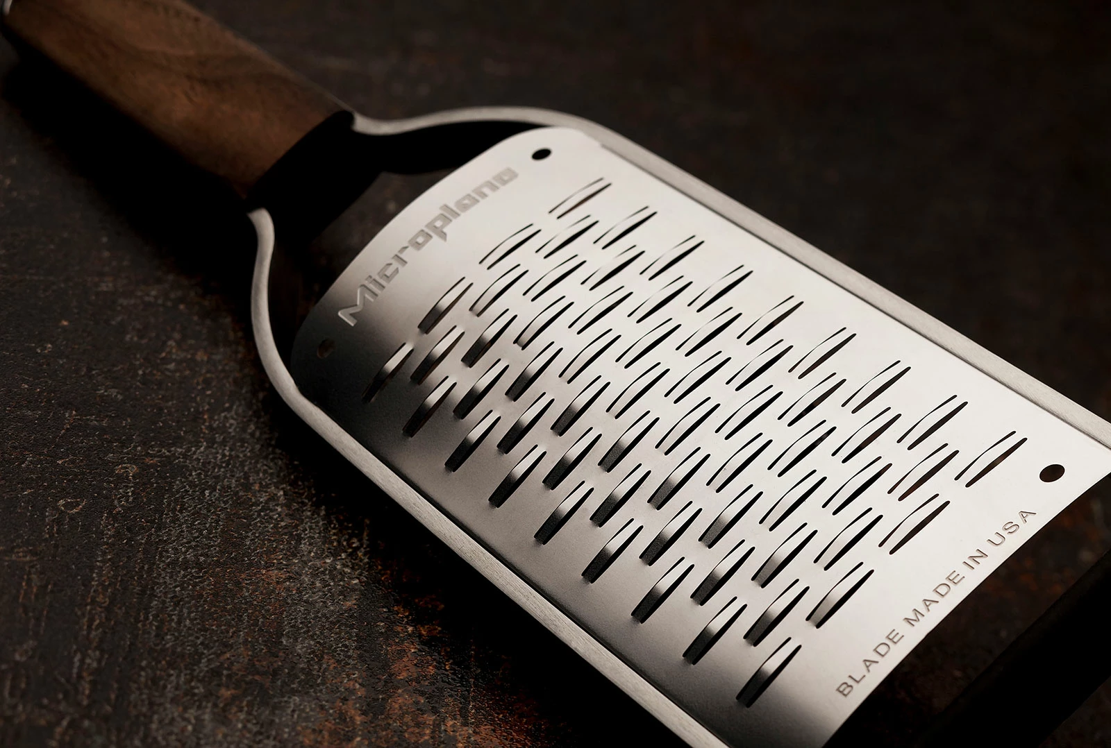 Die Reibe mit 2-Wege-Schneide und Griff aus Walnussholz aus der Microplane Master Serie