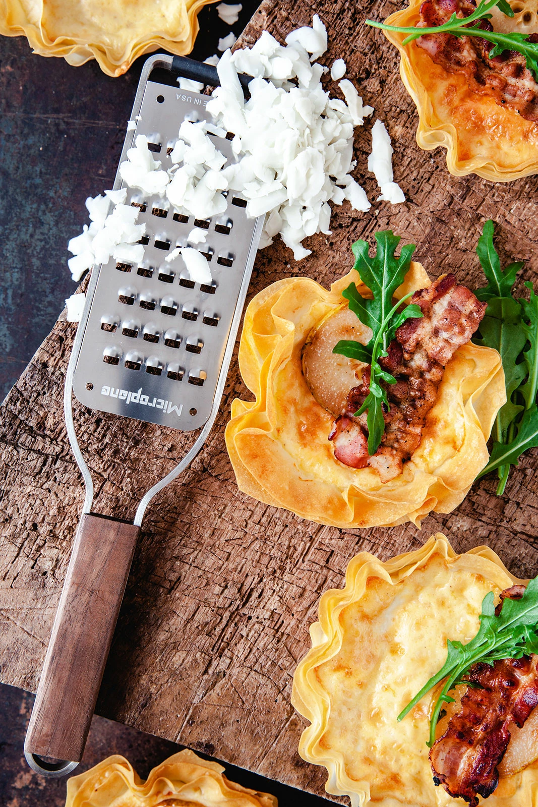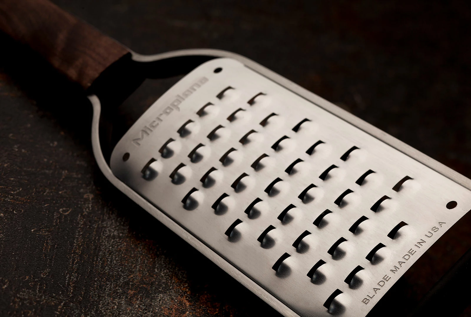 Die Microplane Master Serie bietet Küchen- und Gewürzreiben für den gehobenen Geschmack. Mit ihren edlen Griffen aus geöltem Walnussholz sind diese Reiben nicht nur angenehm zu halten, sondern auch hübsch anzuschauen. Und sie sind praktisch: Das präzise Fotoätzverfahren schafft viele kleine Klingen, die sehr lange scharf bleiben – und ein Gummielement am unteren Ende verhindert, dass die Geräte verrutschen, während Sie sie benutzen.