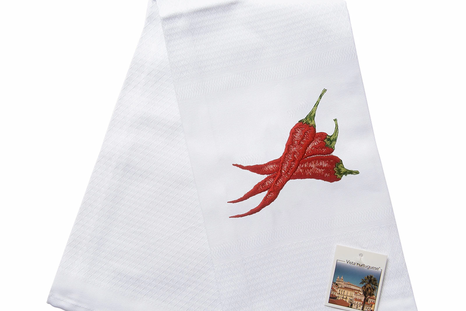 Das weiße Geschirrtuch Chili von Vista Portuguese® bringt zusätzliche Würze in Ihr Leben! Die detailreiche Stickerei dreier Chilischoten macht es anders als andere Handtücher – und der praktische Baumwoll-Jacquard trägt zur Funktionalität bei.
