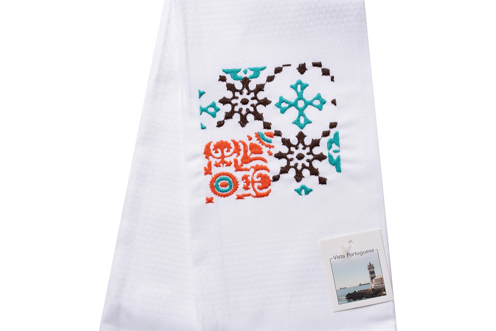Passend zu den Keramik-Kollektionen sind die Vista Portuguese Geschirrtücher mit Einzelmotiven bestickt. Die farbenfrohen, detailverliebten Stickereien auf dem Diamanten-Webmuster haben verschiedene Meerestiere oder Fliesenmuster zur Auswahl. Hier ist das weiße Vista Portuguese Geschirrtuch aus 100 Prozent Jacquard-Baumwolle mit dem schönen Fliesenmotiv.