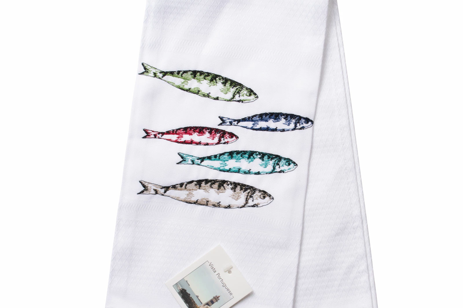 Maritim, mediterran und edel: Das weiße Geschirrtuch Playful Multicolor 50x70cm von Vista Portuguese. Der präzise aufgestickte Sardinenschwarm in Blau, Gelb und Orange steht in apartem Kontrast zu dem weißen Baumwoll-Jacquard. Dieses Handtuch erfüllt nicht nur seinen Zweck, sondern sieht dabei auch noch gut aus.