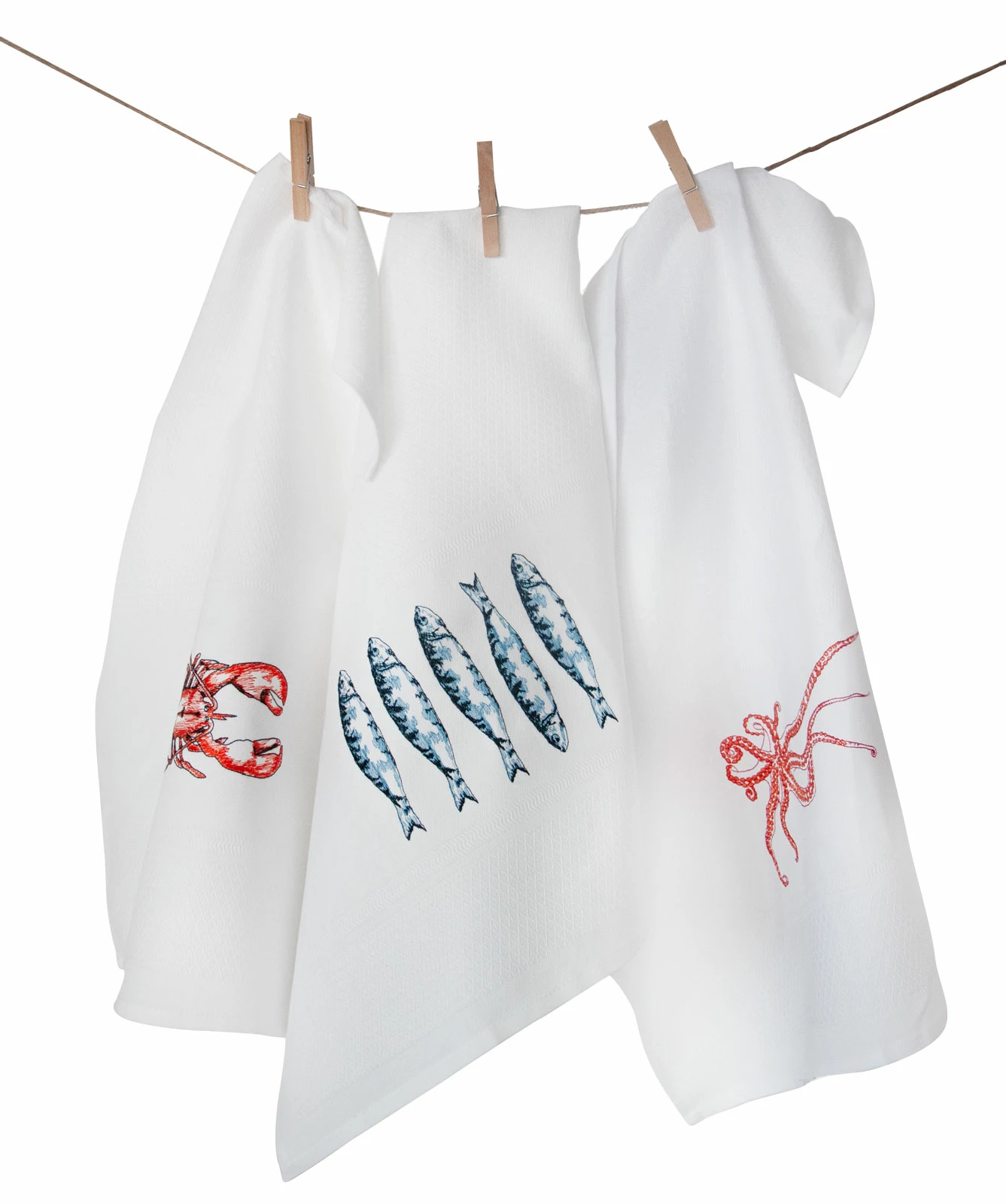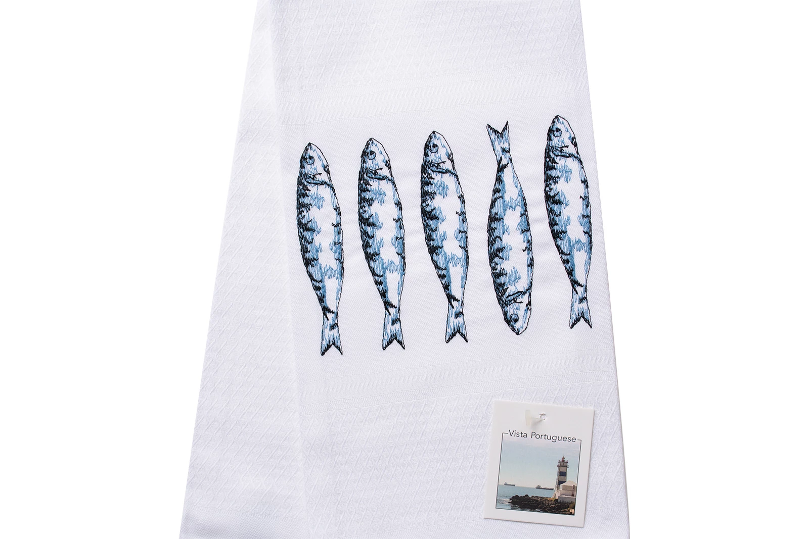 Passend zu den Keramik-Kollektionen sind die Vista Portuguese Geschirrtücher mit Einzelmotiven bestickt. Die farbenfrohen, detailverliebten Stickereien auf dem Diamanten-Webmuster haben verschiedene Meerestiere oder Fliesenmuster zur Auswahl. Hier ist das weiße Vista Portuguese Geschirrtuch aus 100 Prozent Jacquard-Baumwolle mit den schönen Sardinen.