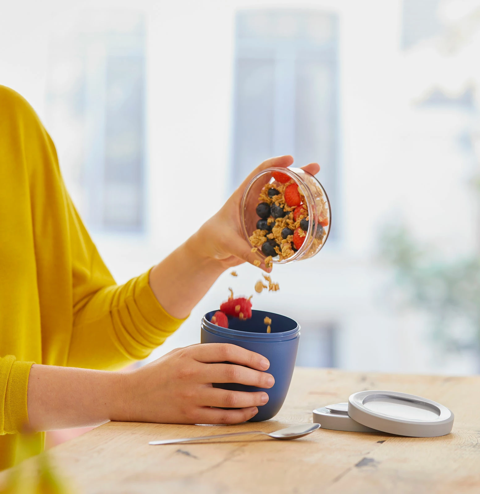 Der Ellipse Lunchpot von Modula in dunklem nordic denim blau hat zwei getrennte Behälter 500ml und 200ml für den kleinen Hunger oder Babies großen Hunger unterwegs: zum Beispiel für Müsli oder frische Früchte getrennt von Joghurt, Knackige Croutons und bunter Salat, Gemüse und Dip, Brot für die Suppe, Soße für den Reis. Die einzelnen Verschlussdeckel passen auf beide Behälter und mit einer einfachen Drehbewegung sind beide Behälter auslaufsicher miteinander verbunden und wieder auseinander geschraubt. Die Zutaten können frisch miteinander gemischt werden. In den oberen, transparenten Behälter mit 200ml Inhalt passen rund 75g Obst, Gemüse oder Müsli. Der untere, farbige Behälter ist mikrowellenfest und hat Platz für eine Portion Joghurt oder Salat, Nudeln oder Suppe.