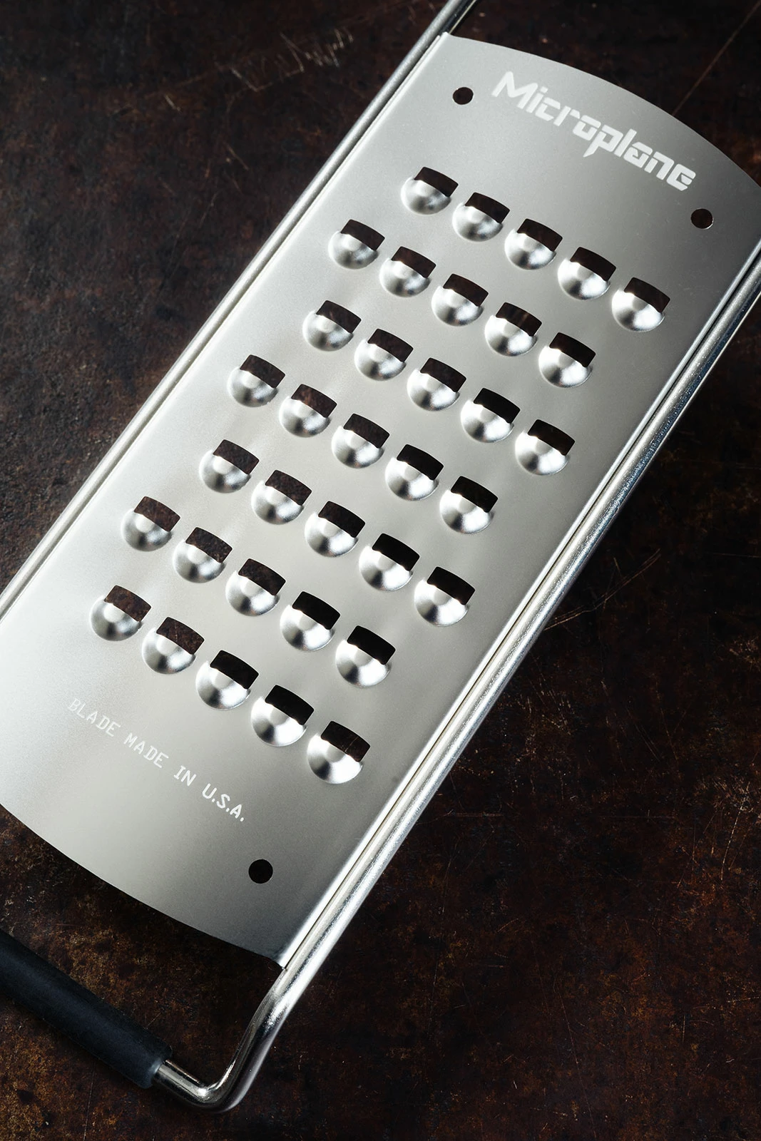 Die scharfen Edelstahlklingen der Microplane Reibe Sehr Grob schwarz hobeln starke Stiftform, zum Beispiel um Aufläufe mit Käse zu bedecken.