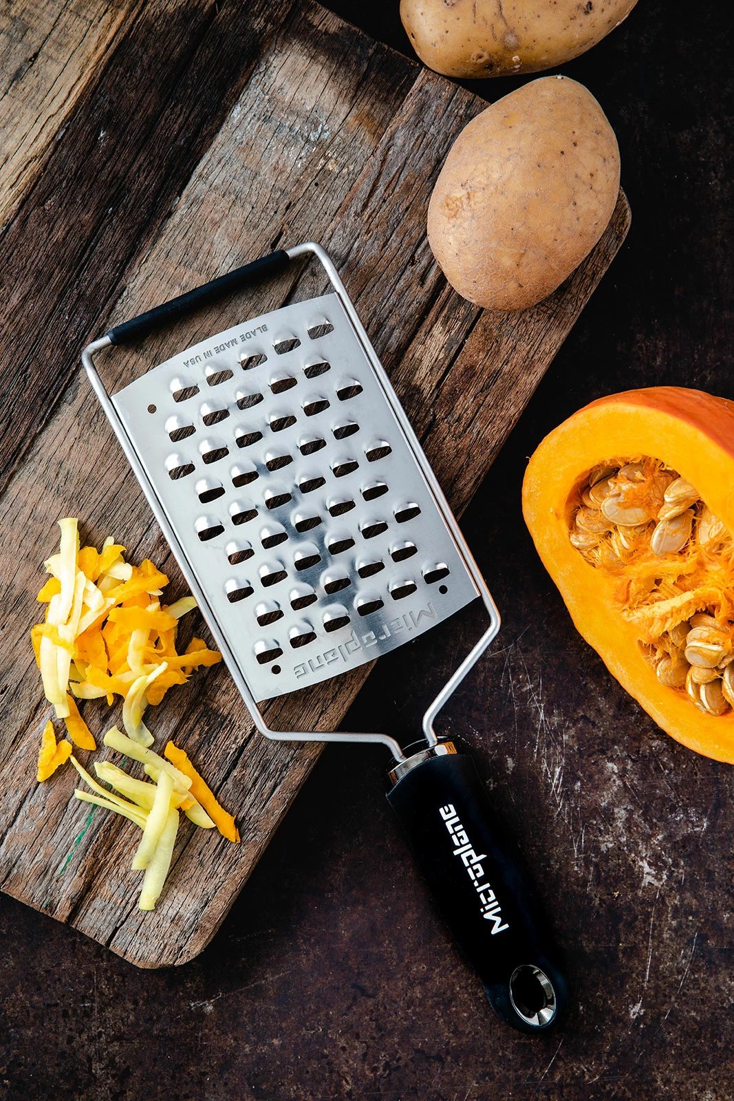 Die Microplane Gourmet-Serie erfüllt die Anforderungen der Profis hinsichtlich Konstruktion und Design. Sie bietet schärfste Reiben und Hobel, die breiter und unterschiedlicher ausgearbeitet sind als die weltberühmte und kernig handfeste Microplane Zester-Reibe. Rutschfeste Gummifüße sorgen für Stabilität und sicheren Halt auf Tellern und Schüsseln. Ein angenehm weicher „soft-touch“ Griff verleiht dieser Serie einen komfortablen Charakter.