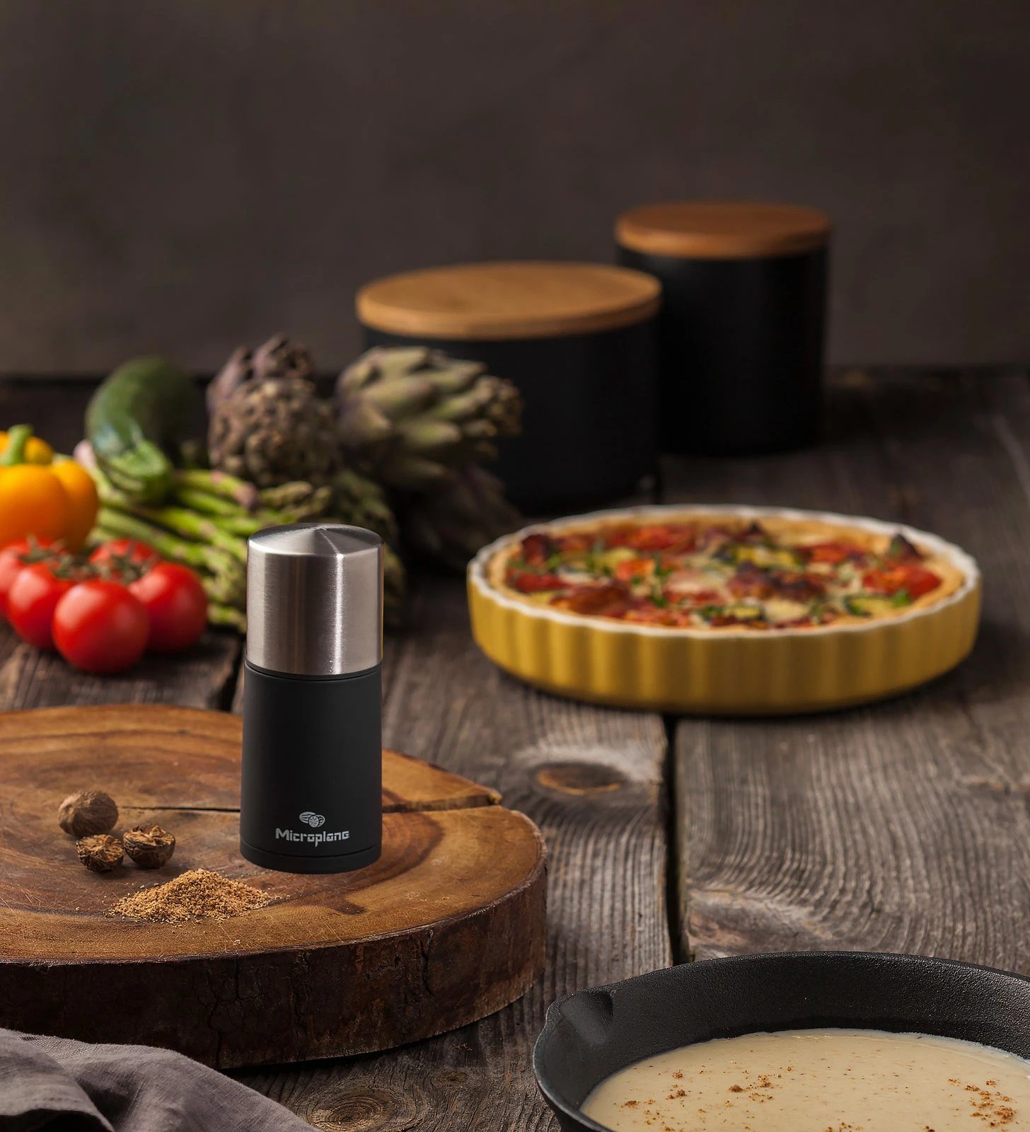 Die Microplane Specialty Muskatmühle 2in1 Edelstahl arbeitet mit harten Gewürzen wie Muskat, Zimt, langem Pfeffer oder auch Tonkabohnen und Nüssen Dank der patentierten Edelstahlklingen präzise, messerscharf und ganz ohne Kraftaufwand. Die Oberfläche der Gewürzmühle mit Edelstahlkopf ist auch haptisch gefällig wie ein Handschmeichler und der praktische Silikonverschluss vermeidet Gewürzstaub. Die ätherischen Öle und Aromastoffe können sich beim Mahlen wunderbar entfalten. Mit dem Red Dort Award für Design Qualität 2018.