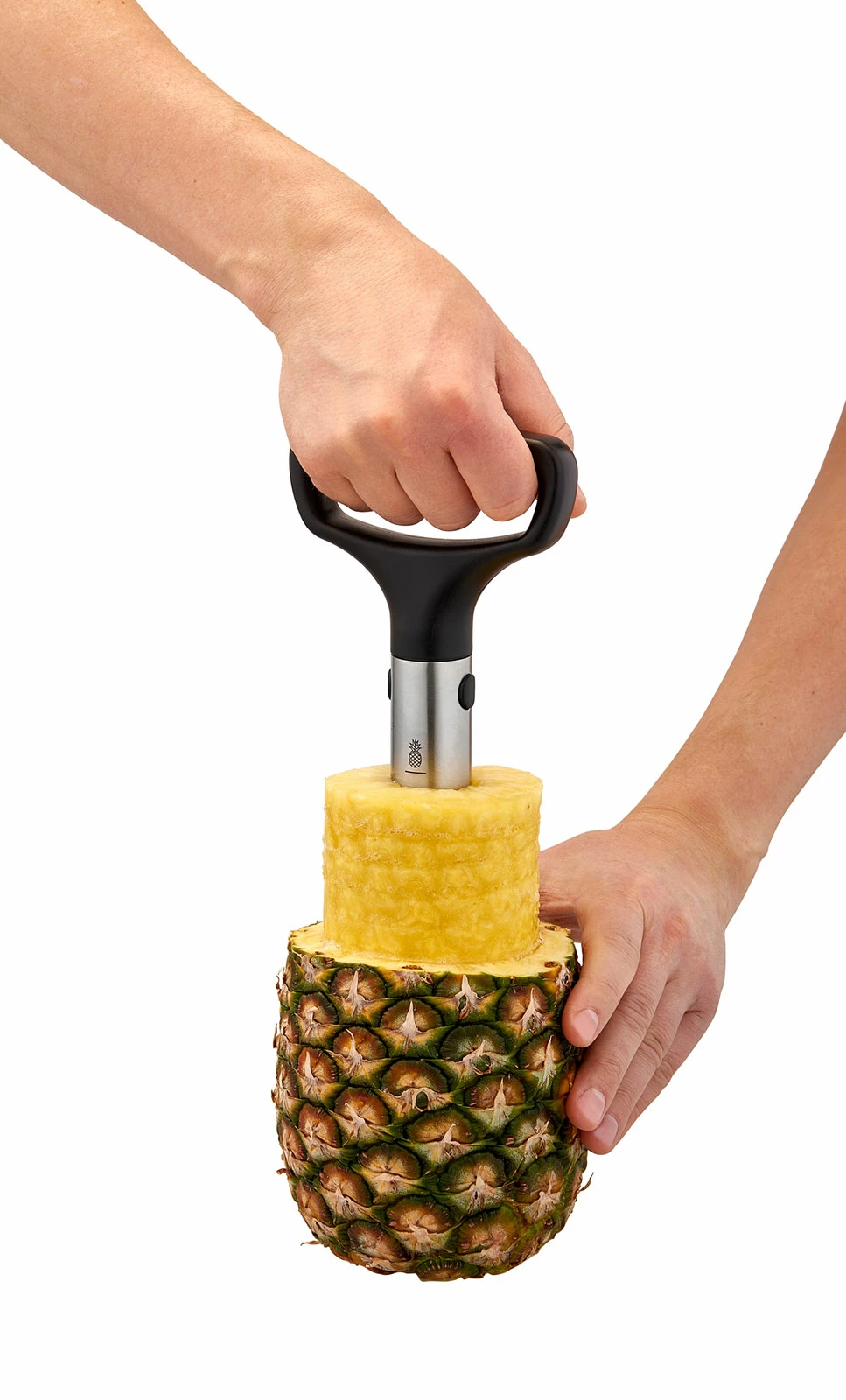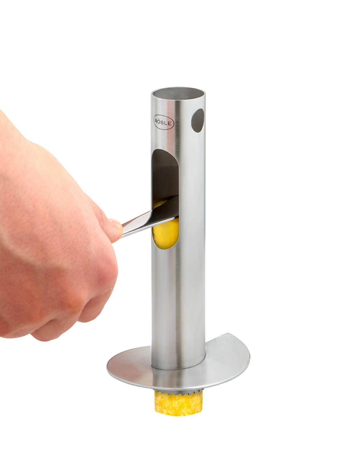 Mit dem Ananasschneider Pro aus der Küchenhelferkollektion von Rösle wird die Zubereitung der exotischen Frucht künftig ganz leicht! Mit ihm können Sie das Fruchtfleisch sauber aus der Ananas schneiden und gleichzeitig den Strunk entfernen. Er ist kinderleicht zu bedienen und zu reinigen.