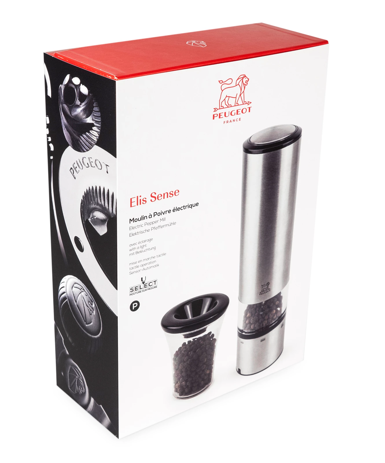 Die Peugeot Elis Sense Pfeffermühle wurde 2016 von der Stiftung Warentest zum Testsieger unter den elektrischen Pfeffermühlen gewählt. Sie reagiert durch ihre Sensortechnik auf eine leichte Berührung oben am Gehäusekopf und der Seite des Korpus. Eine LED Beleuchtung (6 Batterien – es können auch wieder aufladbare Akkus verwendet werden) zeigt genau, wo der gemahlene Pfeffer auf den Teller gelangt. Das Gehäuse besteht aus hochwertigem Edelstahl. Am Fußende lassen sich manuell mit der patentierten u’Select-Technik sechs verschiedene Mahl Grade auswählen/einstellen – von fein bis grob. Mitgeliefert wird auch ein quadratischer Untersetzer, auf dem die Elis Sense Mühle gelagert werden kann, wenn sie einmal nicht benötigt wird.