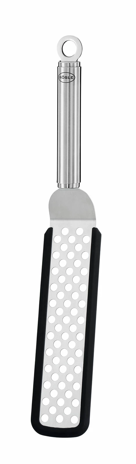 Dieser flexible, 32cm lange Wender mit Rundgriff und Silikonrand aus der Rösle Küchenhelferkollektion ist ein sehr hilfreiches Werkzeug. Der Silikonrand um die Fläche des Wenders herum schützt auch empfindliche Anti-Haft-Beschichtungen in Pfannen und Töpfen. Durch die Löcher auf der Fläche des Pfannenwenders kann überschüssiges Öl abtropfen.