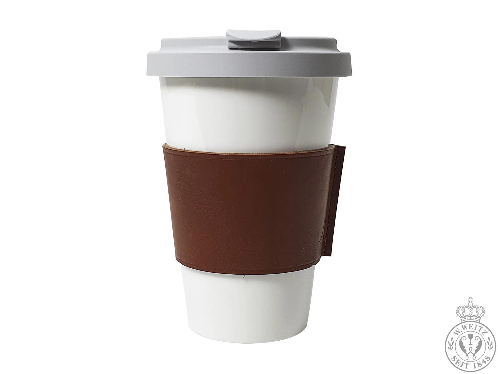 Der Coffee-To-Go Becher mit brauner Lederbanderole aus der Dibbern Geschirr Serie Bone China weiß