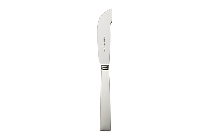 Eine Hommage an die klassische Yacht stellt das versilberte Robbe & Berking Riva Besteck dar, denn die Form des Löffelmundstücks erinnert an den Bug einer Yacht. Die Stiele sind schlicht, werden zum Ende hin ein wenig breiter und schließen eckig ab. Der Hanseat Wilfried Moll hat die Kollektion entworfen – auch sie ist spülmaschinenfest und zudem das Restaurantbesteck im „Museum of Modern Art“ in New York. Die von Robbe & Berking verwendete 150g Massiv-Versilberung hat eine 2/3 stärkere Silberauflage als herkömmlich versilberte Bestecke (90g) – das Ergebnis: eine längere Lebensdauer und somit mehr Freude für Sie. Für Franzosen ist Käse ein Lebensgefühl – zusammen mit Baguette und gutem Wein ist alles schon viel schöner. Damit Sie Ihren Käse auch gut schneiden können, gibt es von Robbe & Berking das versilberte Riva Käsemesser. Es schneidet mit seiner Stahlklinge sowohl Camembert als auch mittelharten sowie festen Käse. Mit der nach oben gehenden Spitze an der Klinge können Sie das abgeschnittene Käsestück aufspießen, um es auf Ihren Teller zu befördern. Wenn Ihnen das Käsemesser zusagt, könnte Ihnen auch das Buttermesser gefallen. Nachkaufgarantie bis 2040.