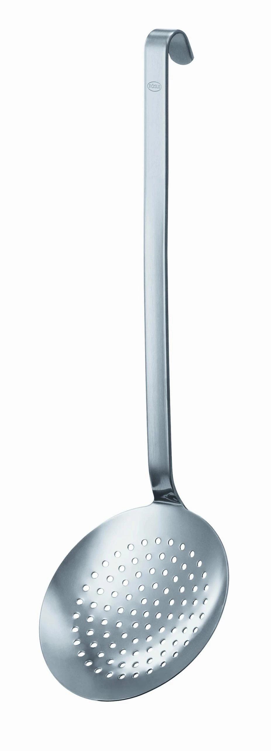 Der Rösle Haken Schaumlöffel flach grob gelocht 12cm aus Edelstahl mit extra breitem und flachem Boden hebt empfindliche Speisen auch mit Kleinteilen restlos und schonend aus der Flüssigkeit. Mit Haken zum griffbereiten Aufhängen an der Küchenleiste.