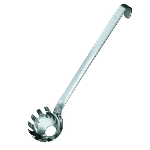 Der Rösle Haken Spaghettiheber lang 29,5cm aus Edelstahl kann mit dem gezackten Rand und dem Ablaufloch Nudeln einfach portionieren, herausheben und servieren. Mit Haken zum griffbereiten Aufhängen an der Küchenleiste.