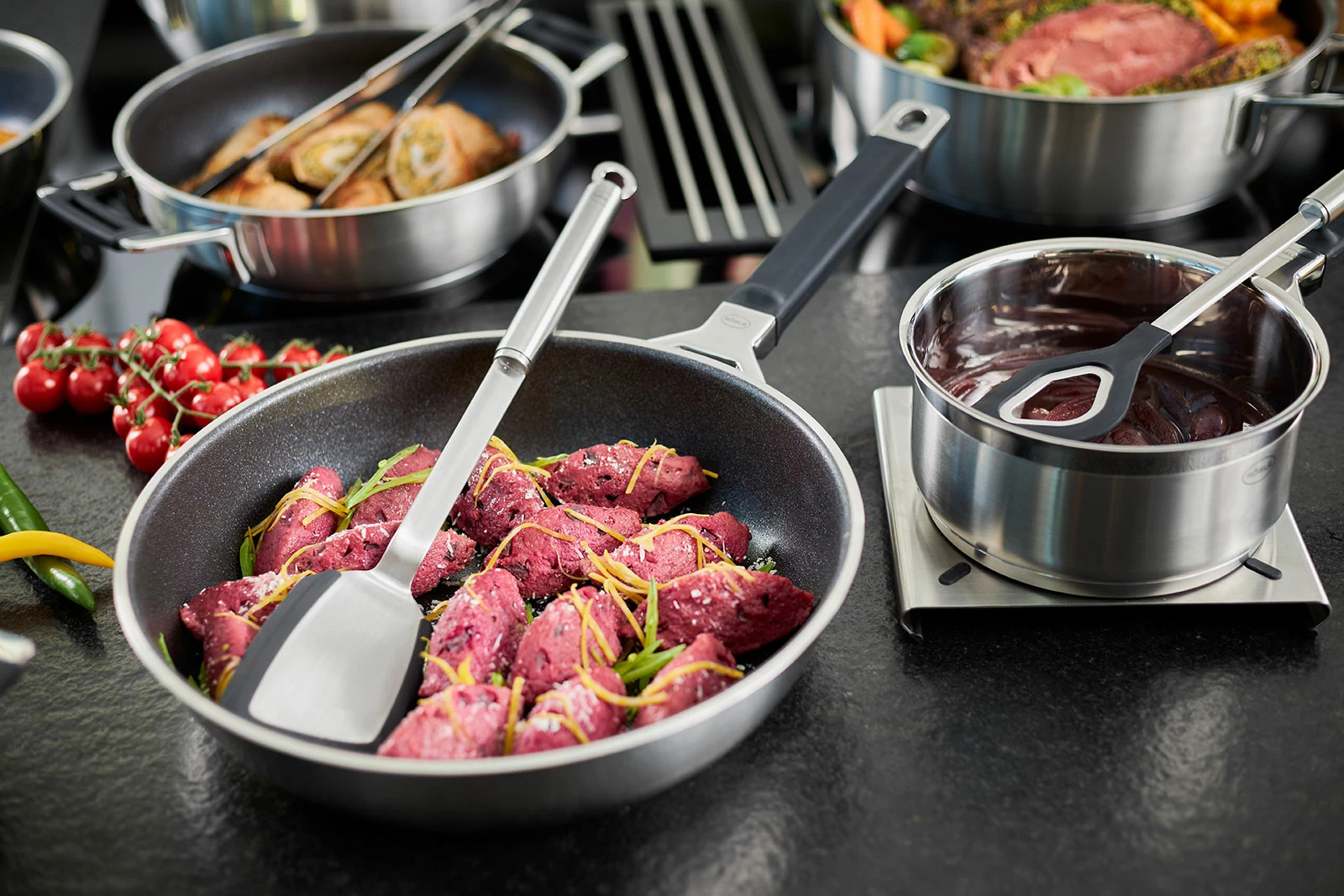 Sanft auch zur Anti-Haft-Beschichtung: Der Rundgriff-Pfannenwender mit Silikonrand aus der Küchenhelferkollektion von Rösle. Dank der Silikonlippe kann der Wender aus Edelstahl problemlos auch in empfindlichen Pfannen genutzt werden.
