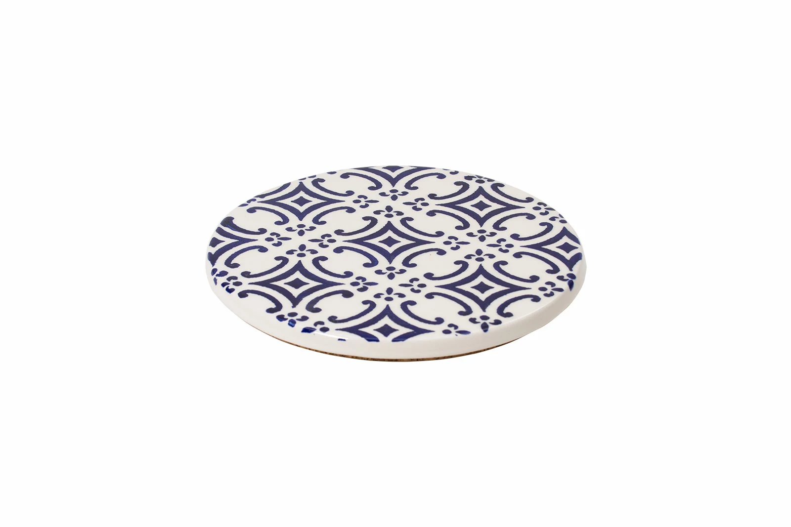 Diese kleine runde Platte aus der Cobalt-Kollektion von Vista Portuguese® bietet auf 17cm Durchmesser Platz für die Darreichung von Beilagen oder süßen Leckereien. Das aparte blau-weiße Muster bietet dabei einen interessanten Fokuspunkt auf dem gedeckten Tisch. Dank der mit Kork verkleideten Unterseite kann diese Platte auch toll als Topfuntersetzer verwendet werden.