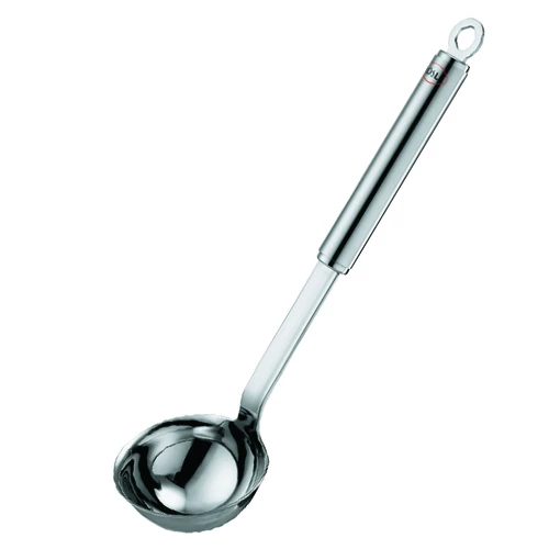 Der Rösle Rundgriff Schöpflöffel aus Edelstahl zum tropffreien Ausgießen und Dosieren mit Schüttrand. Der Rundgriff mit Aufhängeöse ist wasserdicht.