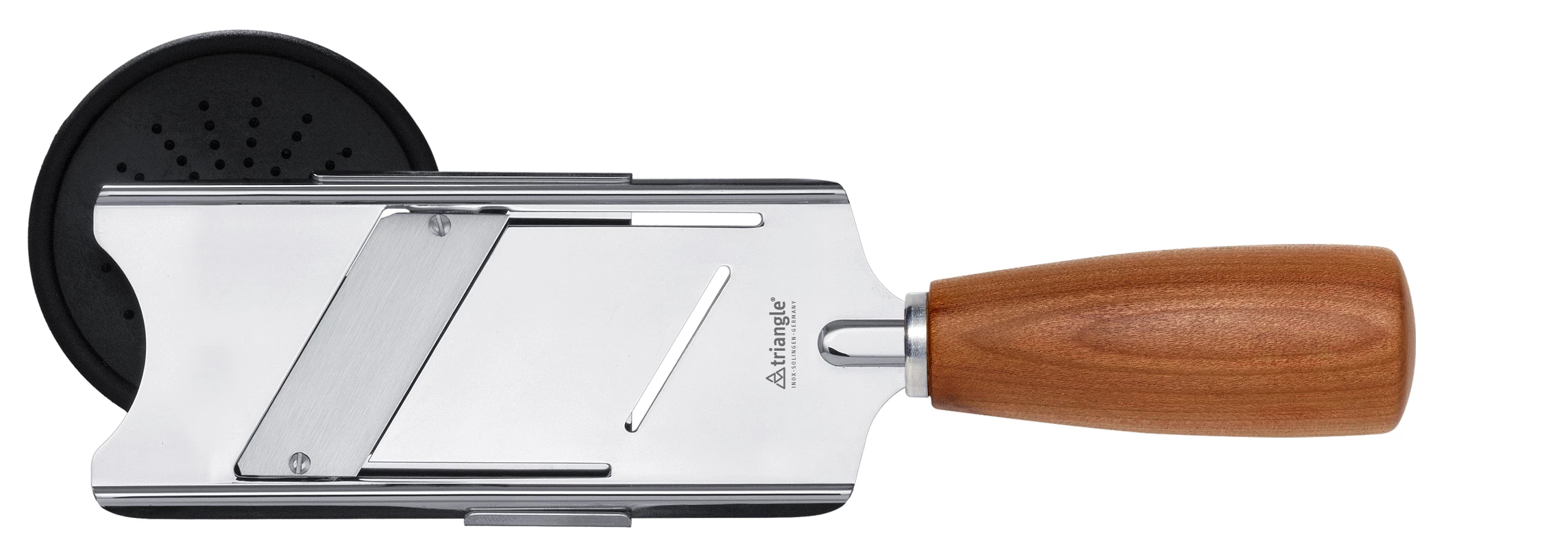 Der Triangle Solingen Soul Feinhobel mit Restehalter hat einen Griff aus Pflaumenholz und eine stufenlos verstellbare Klinge aus gehärtetem, rostfreien Stahl. Der Spezialstahl bleibt dauerhaft sehr lange scharf. Sie können hauchdünn zum Beispiel Knoblauch und Parmesan, Chili und Trüffel hobeln. Der Feinhobel ist variabel bis zu einer mitteldicken Stärke etwa von Zucchini, Möhren und Kartoffeln. Mit dem Restehalter verarbeiten Sie alle Reststücke sicher und restlos.