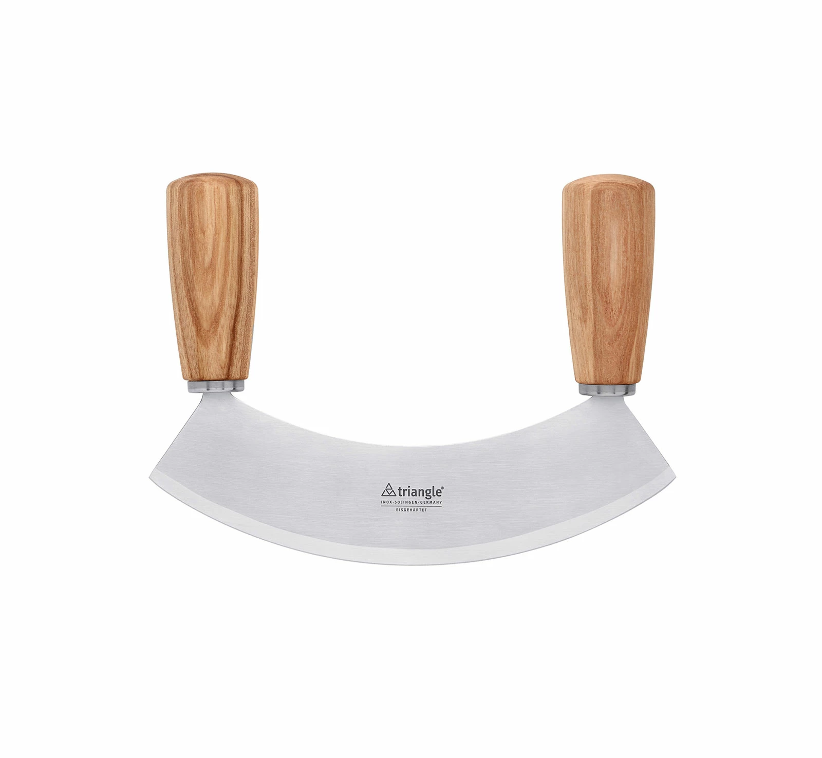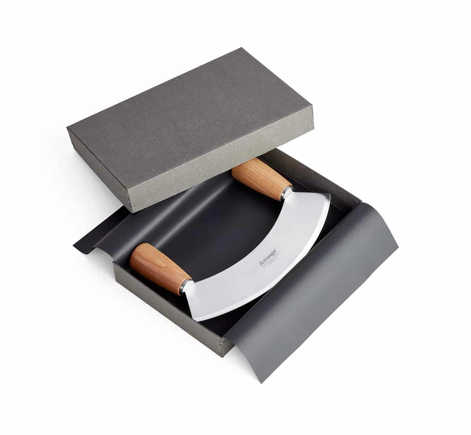 Dieses einschneidige Wiegemesser mit der 17,5cm langen Klinge von Triangle Solingen kann mit Griffen aus Kernesche prahlen und wird zudem noch im edlen Karton geliefert. Die hochwertig gehärtete Klinge eignet sich hervorragend zum schnellen Zerkleinern von Kräutern oder Knoblauch, kann aber auch verwendet werden, um beispielsweise Blechkuchen zu schneiden.