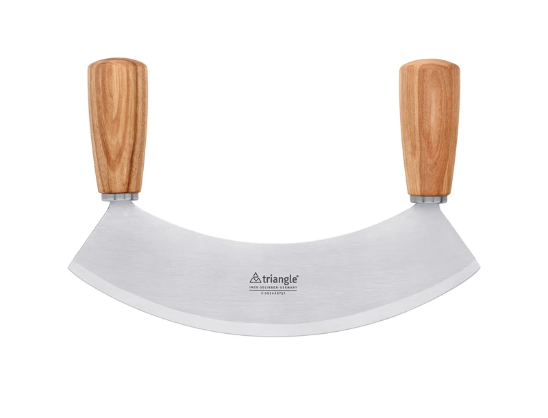 Das Triangle Solingen Soul Wiegemesser 23 cm hat zwei ergonomisch geformte Griffe aus Kernesche und eine besonders hochwertig gehärtete Klinge, eine Seltenheit bei Wiegemessern. Der Spezialstahl bleibt dauerhaft sehr lange scharf. Große Wiegemesser mit 23 cm von Triangle Solingen sind neben dem mühelosen Zerkleinern von Kräutern, Knoblauch oder Nüssen auch hervorragend geeignet, Pizza, Flamm- oder Blechkuchen zu schneiden.