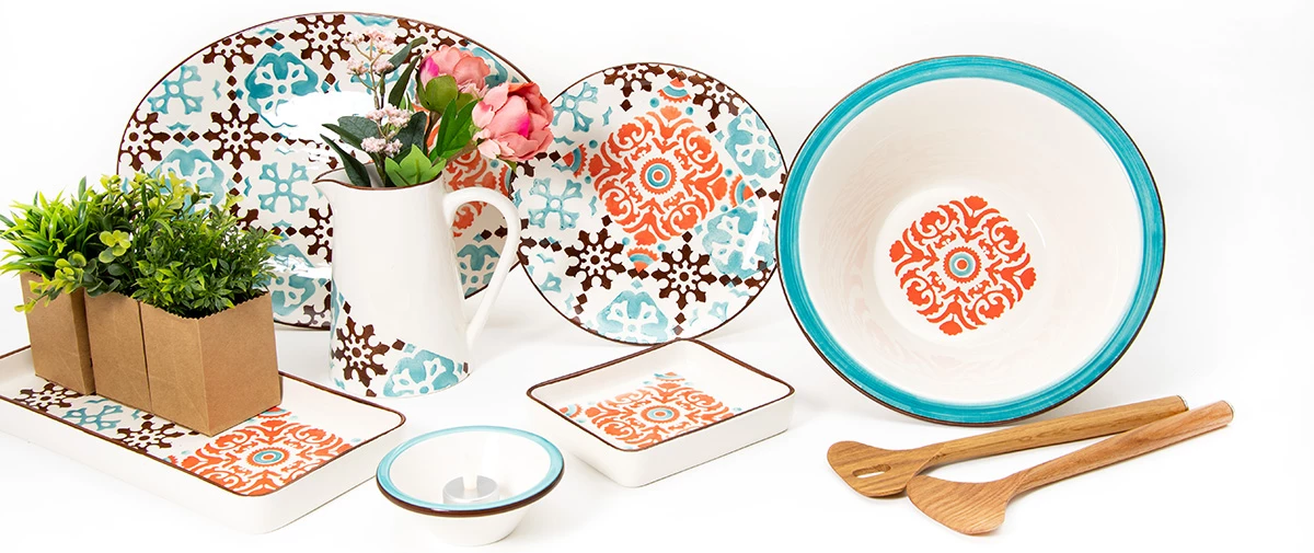 Die Keramikserie Mosaic New Coral ist inspiriert von den Wahrzeichen Portugals, den traditionellen Fliesenmustern der Azulejos. Das Flair portugiesischer Städte, gepaart mit den Farben des Meeres und ziegelgebrannter Erde macht diese handbemalte Kollektion zu einem besonderen Erlebnis auf dem gedeckten Tisch. Die handgemachte und -bemalte Steingut-Keramik mit gestempelten Mosaik-Motiven hat einzigartige Farbverläufe und jedes Stück ist ein Unikat.