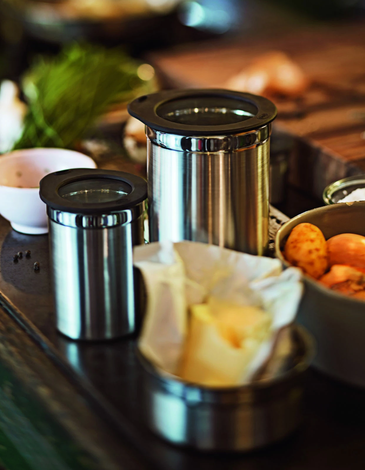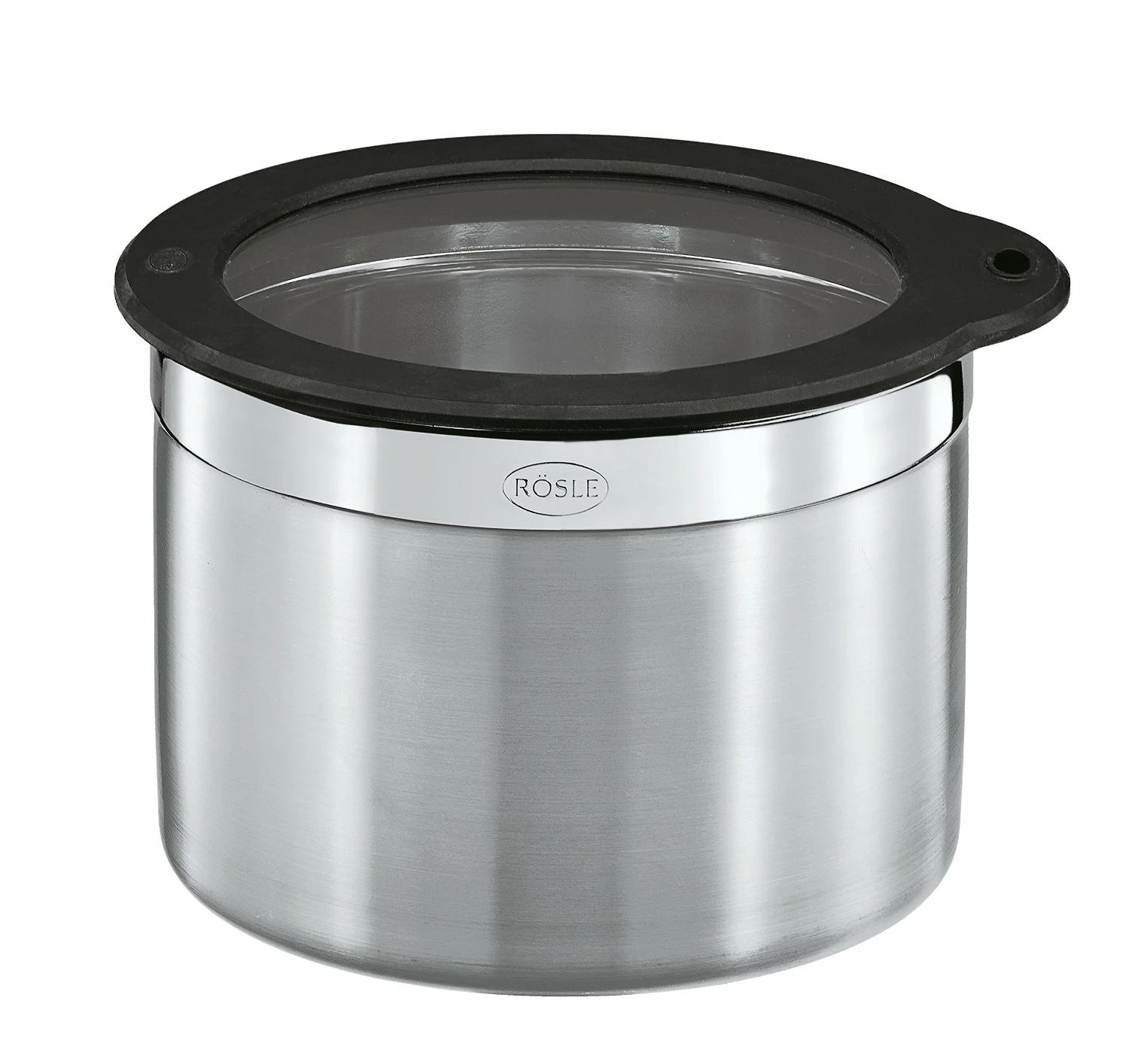 Die Aufbewahrungsdosen von Rösle setzen auf hochwertige Materialien für lange Haltbarkeit. Der Edelstahlkörper ist geschmacksneutral und wird durch einen Glasdeckel mit Silikonrand luftdicht geschlossen. So können sowohl Kräuter und Gewürze als auch Lebensmittelreste ganz hervorragend in diesen Dosen frischgehalten werden.
