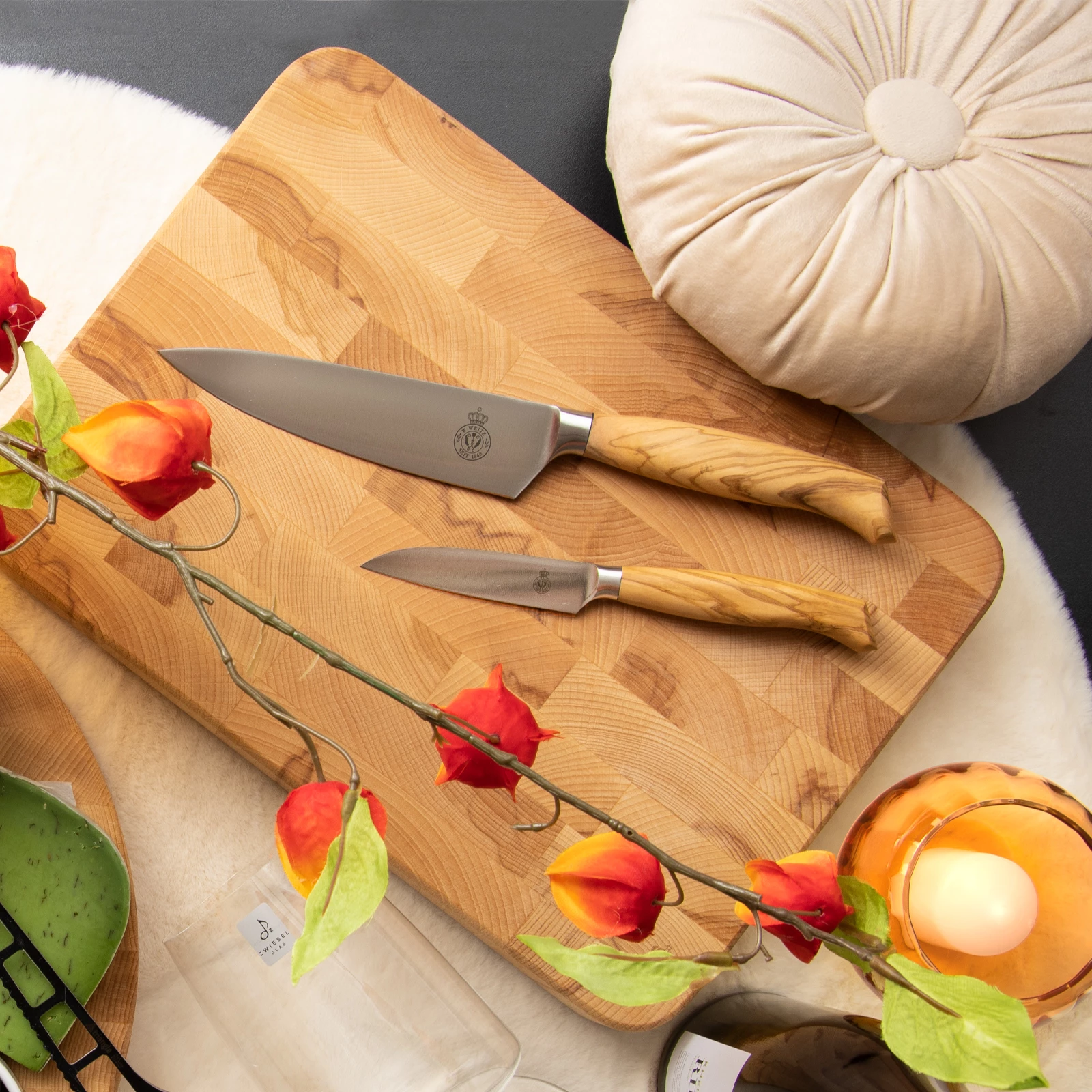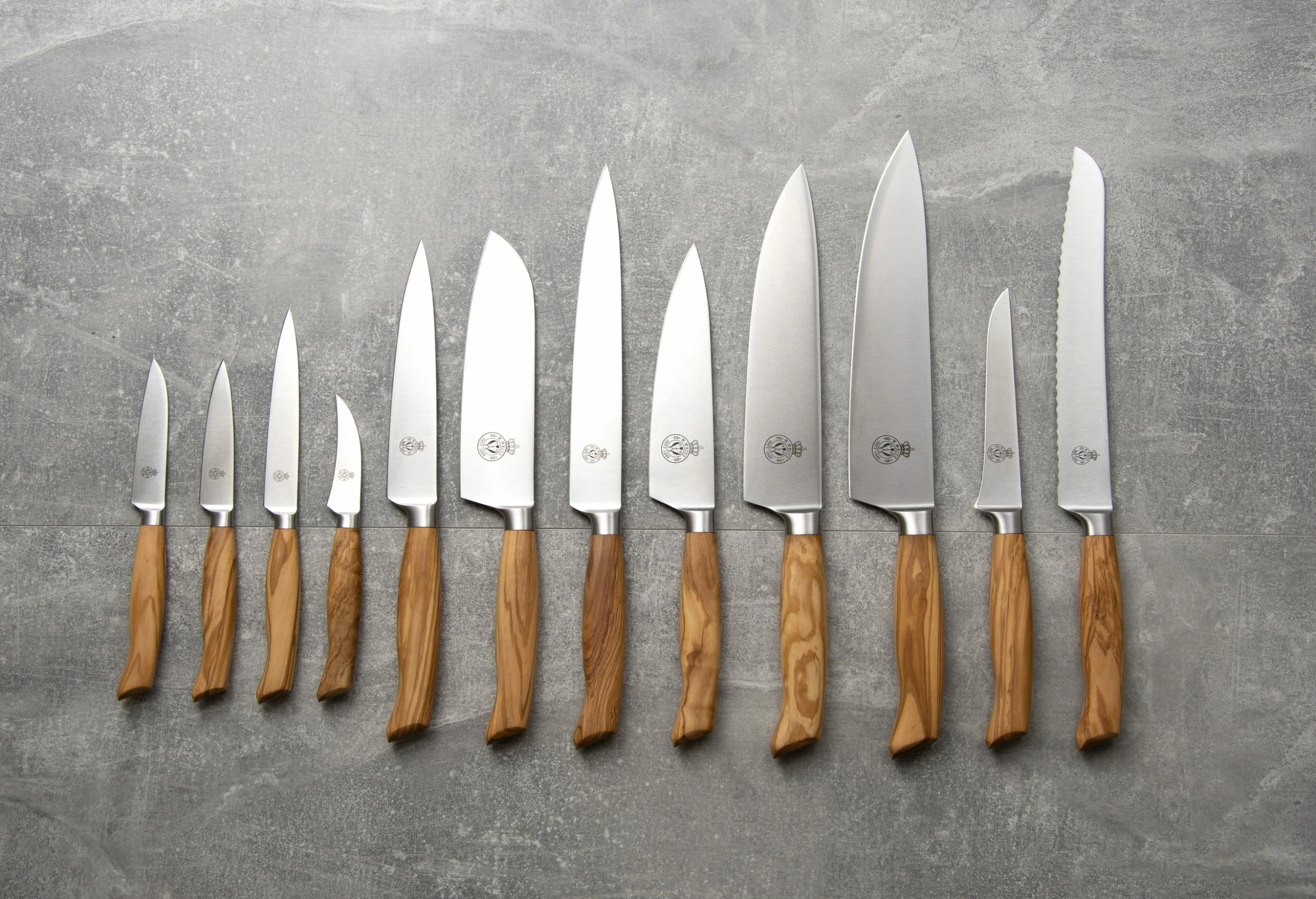 | Material | Rostfreier Edelstahl, geschmiedet, DIN 1.4116, 57 Rockwell, Griff aus Olivenholz, transparenter Klingenschutz aus Kunststoff |
